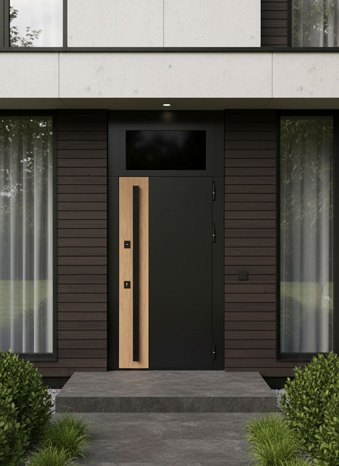 Для дома логична входная дверь с верхней фрамугой и стеклопакетом: свет и масштаб портала работают на фасад. Для квартиры чаще выбирают глухую верхнюю вставку: она точнее «сажает» блок в высокий проём и не требует сложных стекольных решений.